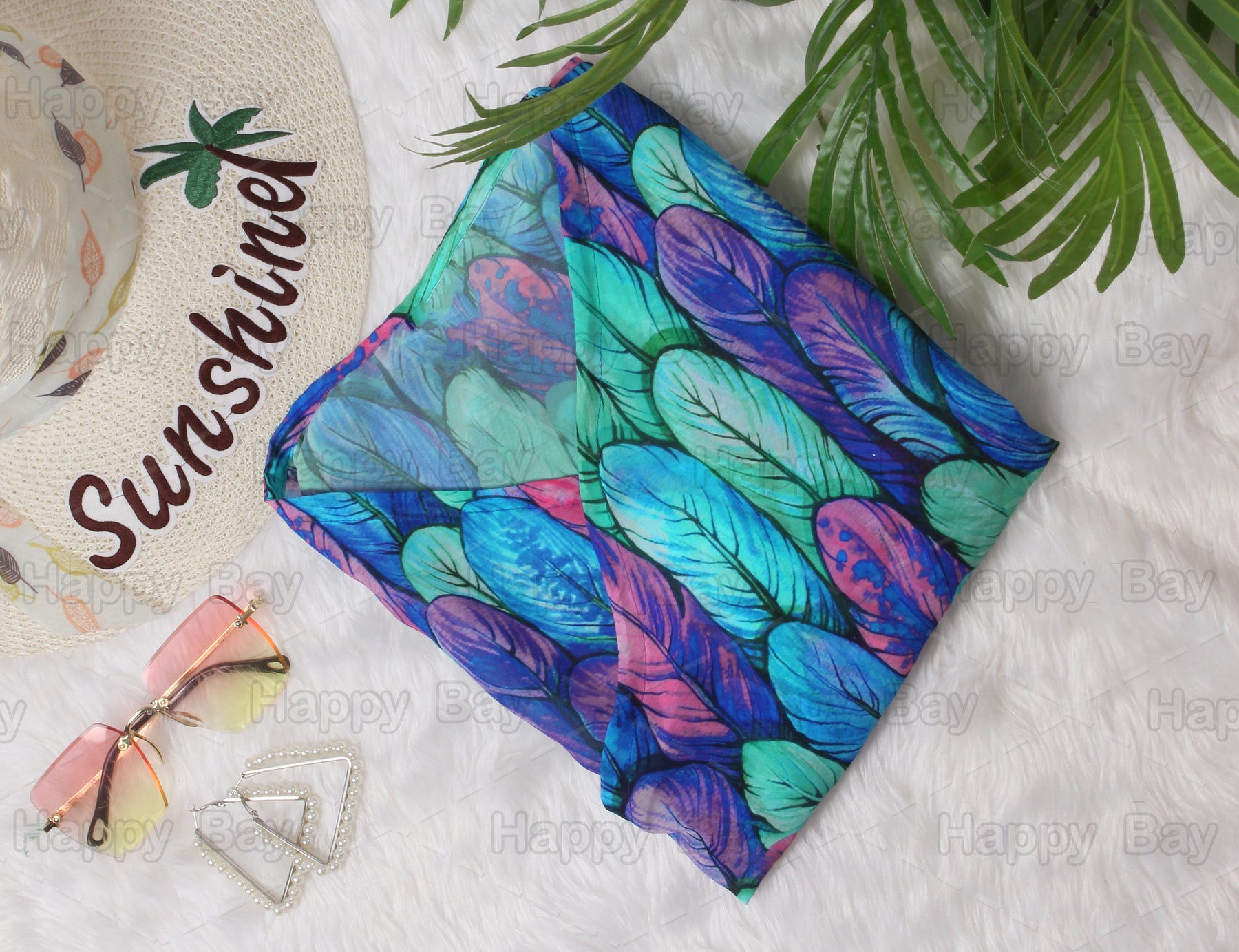 This ethereal and versatile piece is designed to bring a touch of bohemian whimsy to your wardrobe. The kimono silhouette of this shrug jacket exudes an effortless and relaxed vibe, allowing you to effortlessly layer it over a variety of outfits. The sheer fabric adds an air of mystery, while the Multi color Feather Print adds a touch of playful sophistication.