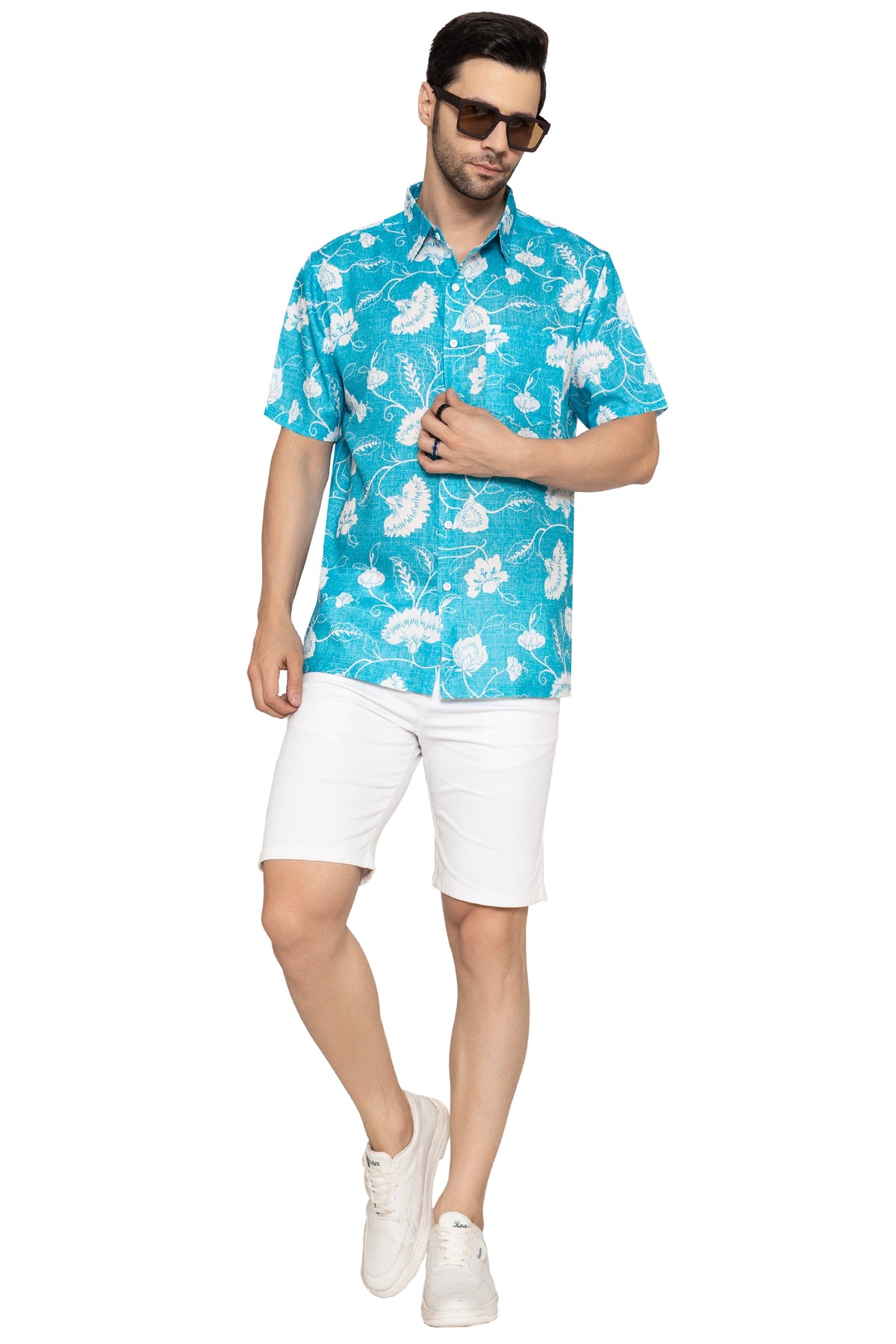 Behold the Linen Effect Men's Shirt featuring a captivating Palm Tree and Island print in classic White and Royal Blue.