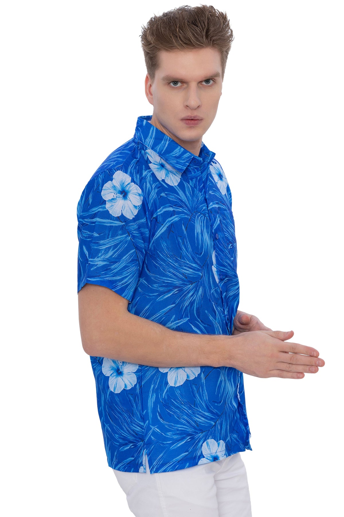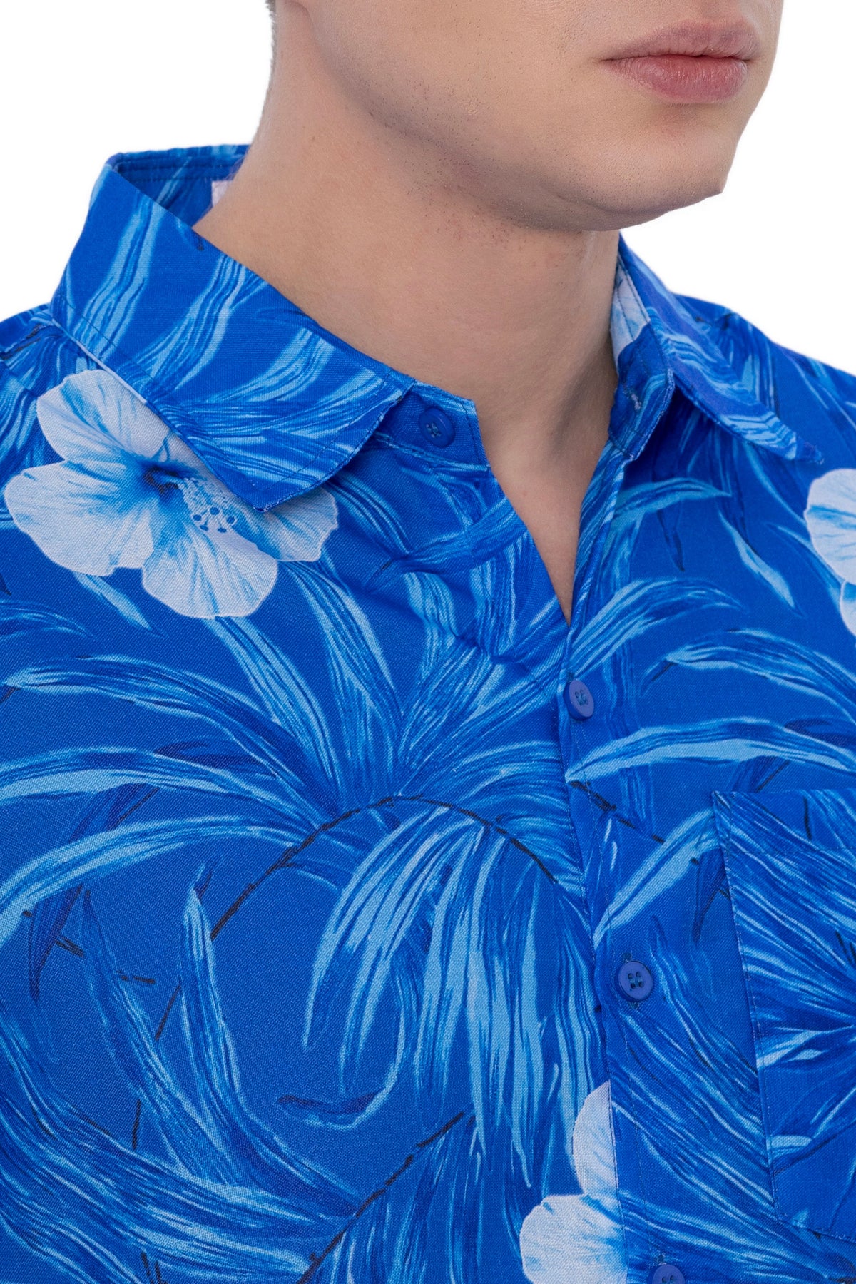 Behold the Linen Effect Men's Shirt featuring a captivating Palm Tree and Island print in classic White and Royal Blue.
