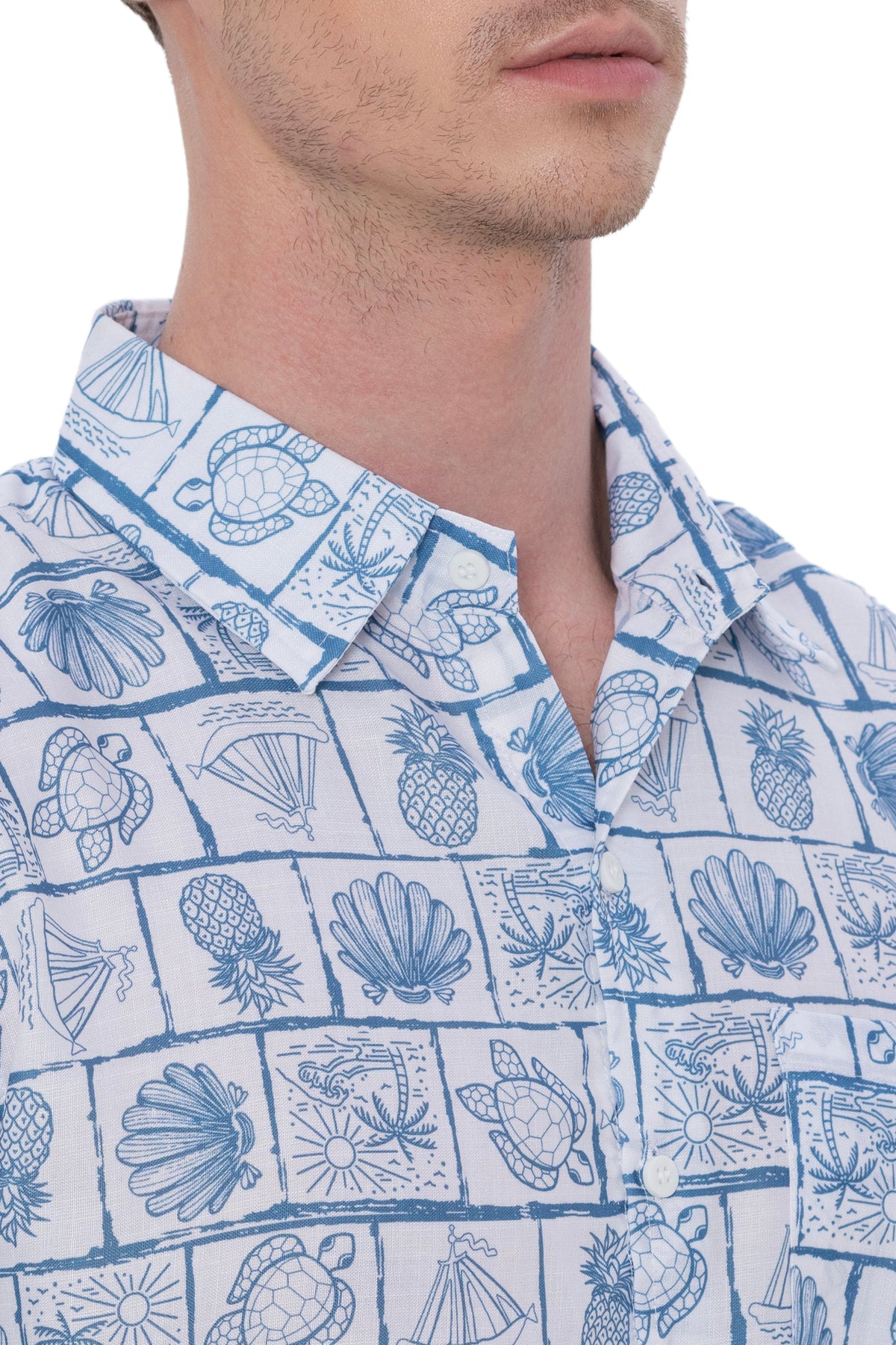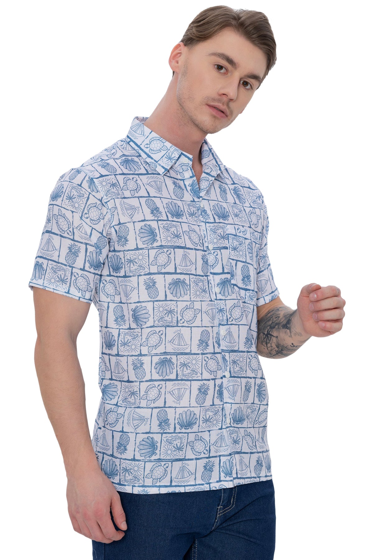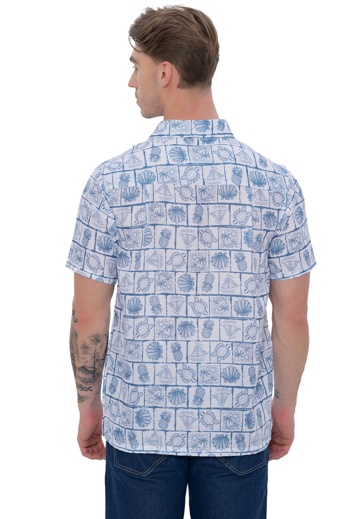 Behold the Linen Effect Men's Shirt featuring a captivating Palm Tree and Island print in classic White and Royal Blue.