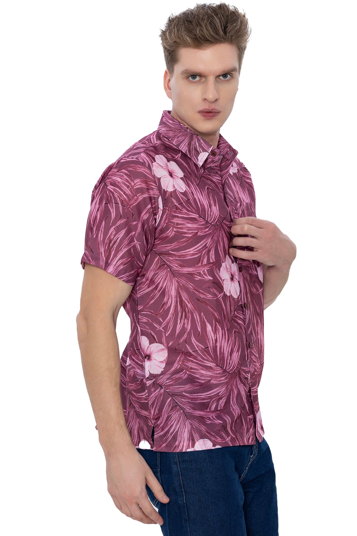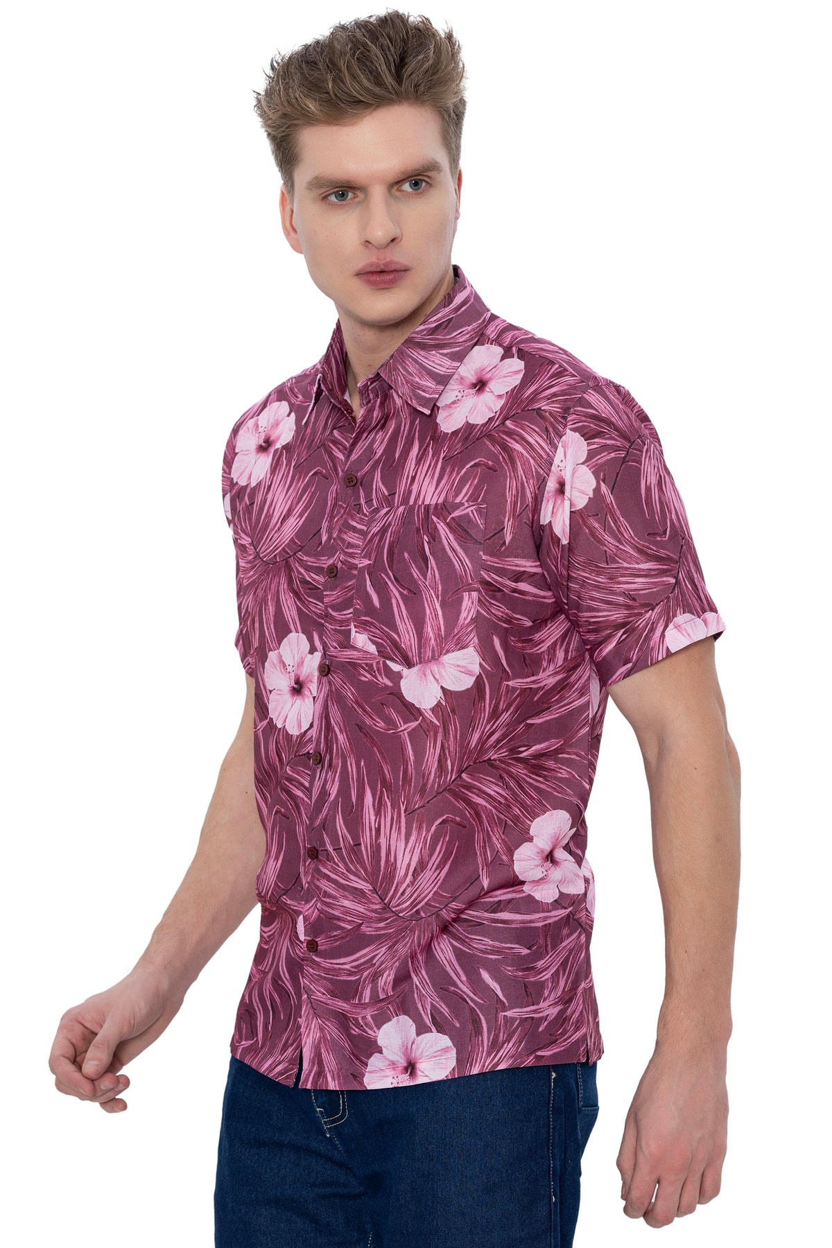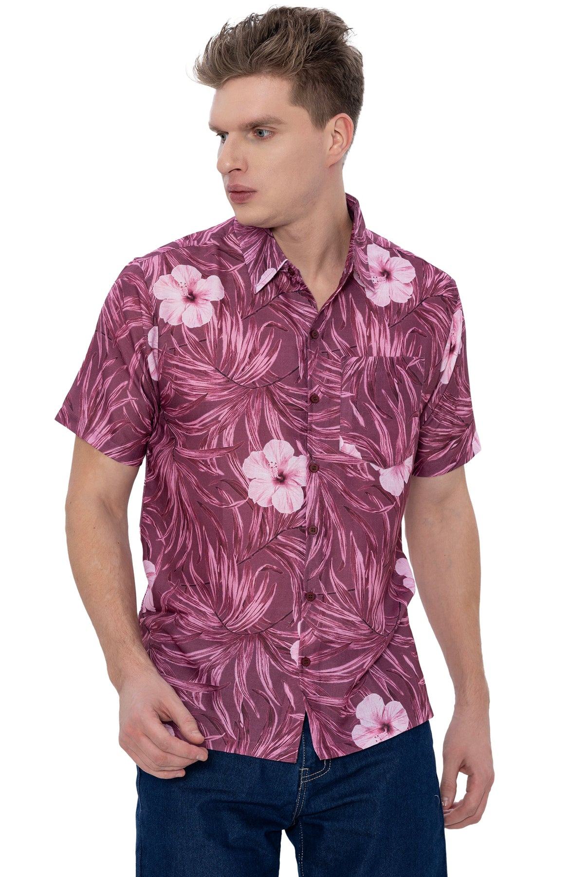 HAPPY BAY Mens Hawaiian Shirts Maroon Floral Leafs P07226