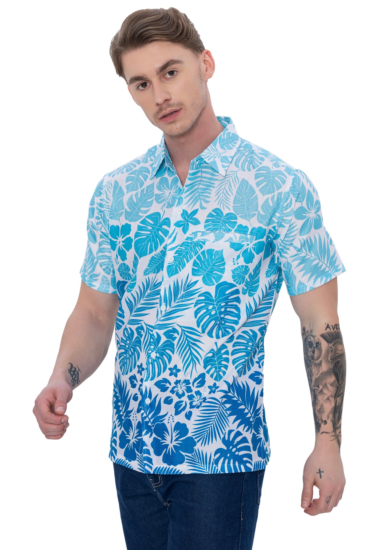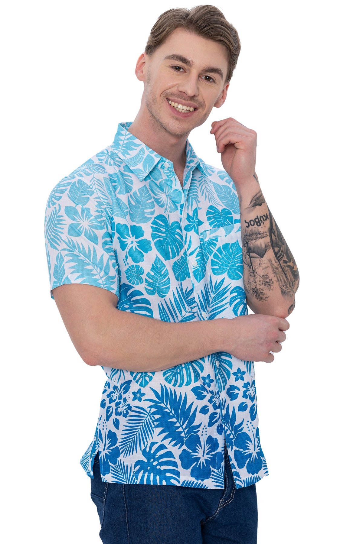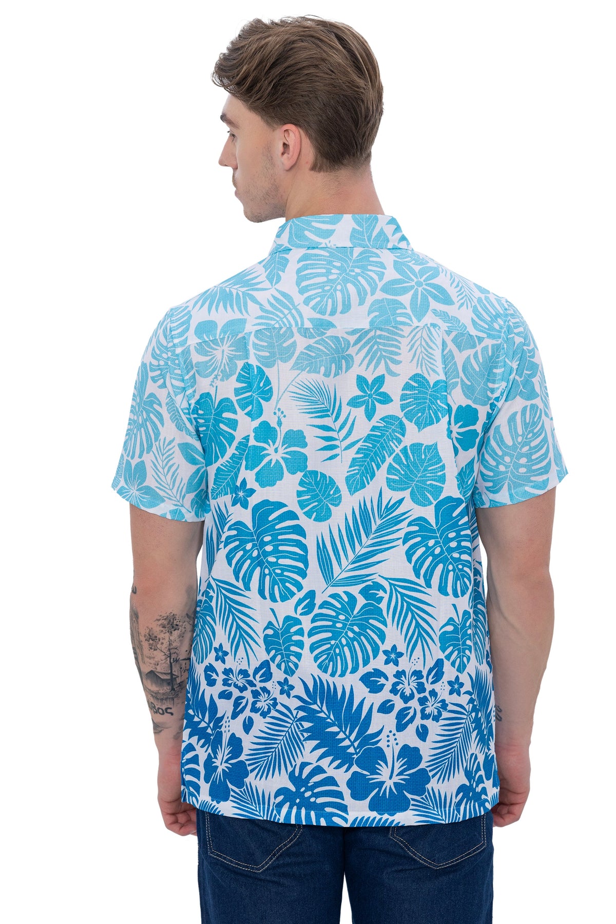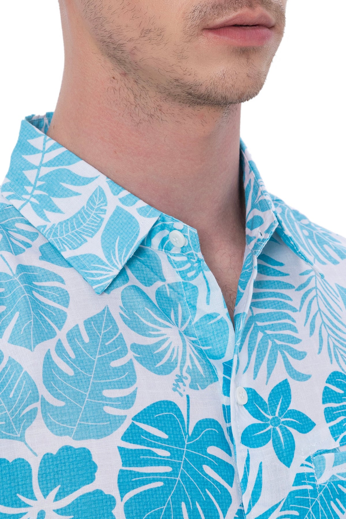 Behold the Linen Effect Men's Shirt featuring a captivating Palm Tree and Island print in classic White and Royal Blue.