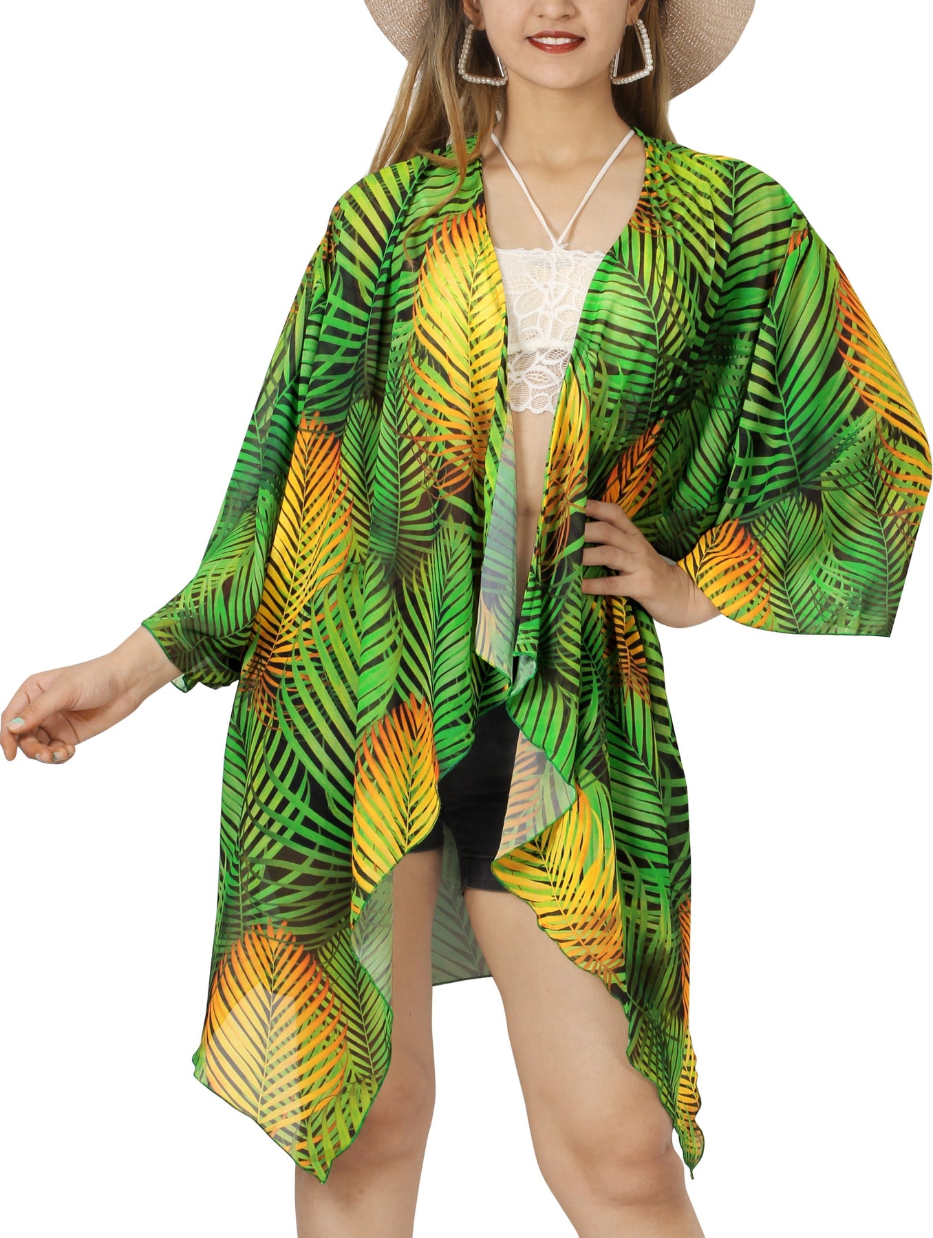 This chic and airy piece is adorned with an enchanting Allover Palm Tree Print in a sophisticated Black and Green palette, making it a stylish ode to island elegance.The kimono silhouette of this shrug jacket provides an easy and flowing drape, allowing you to effortlessly layer it over various outfits.