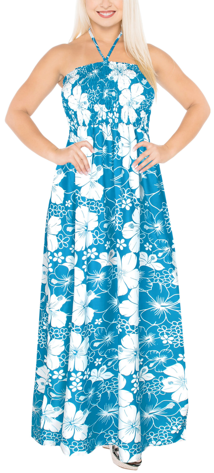 Features : Elastic Bodice, Halter Neck Tie, High Waist, And A Long Flowy Hemline, Pull On Closure, Elastic Ruched Top And A Flared A-line Skirt Dress, Casual, Off Shoulder, Patterns And Vibrant Prints, Adjustable Spaghetti Straps